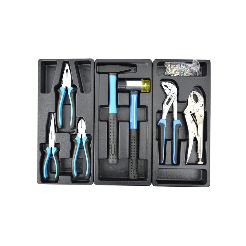 - 4. fiók (53 cm x 5,5 cm x 45 cm) : vízpumpa fogó, patentfogó, oldalcsípő fogó, telefonfogó, kombinált fogó, lakatos kalapács, műanyag kalapács