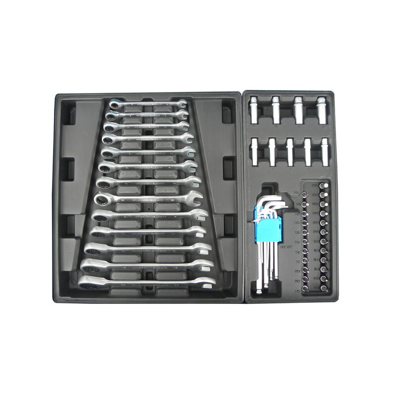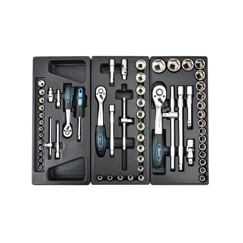 - 1. fiók (53 cm x 5,5 cm x 45 cm) : 1/4″; 3/8″; 1/2″ méretű dugókulcs készletek, racsnis és fix hajtókarokkal